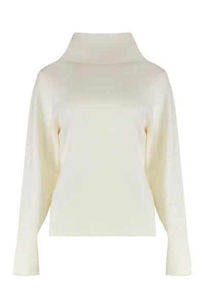 Sweater with an elegant and modern design, characterized by a high collar and long sleeves. made from a soft cream-colored material, it offers comfort and warmth. the silhouette is slightly flared, ideal for a casual-chic look. 75% wool, 15% cashmere, 10% elastane Composition: 75% % Wool, 15% % Cashmere, 10% % Elastane