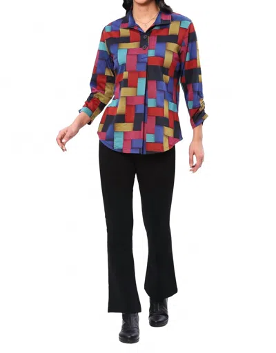A versatile blouse that works from desk to dinner!Introducing the Glory Pullover Top by Parsley & Sage, a stylish maximalist piece perfect for spring travel and Thanksgiving gatherings. This women's blouse offers a geometric pattern in a vibrant multi-color design, crafted from a breathable cotton blend. It features three-quarter sleeves and a collar neckline, complemented by a convenient button closure. Available in plus sizes, making it a versatile choice for any wardrobe.