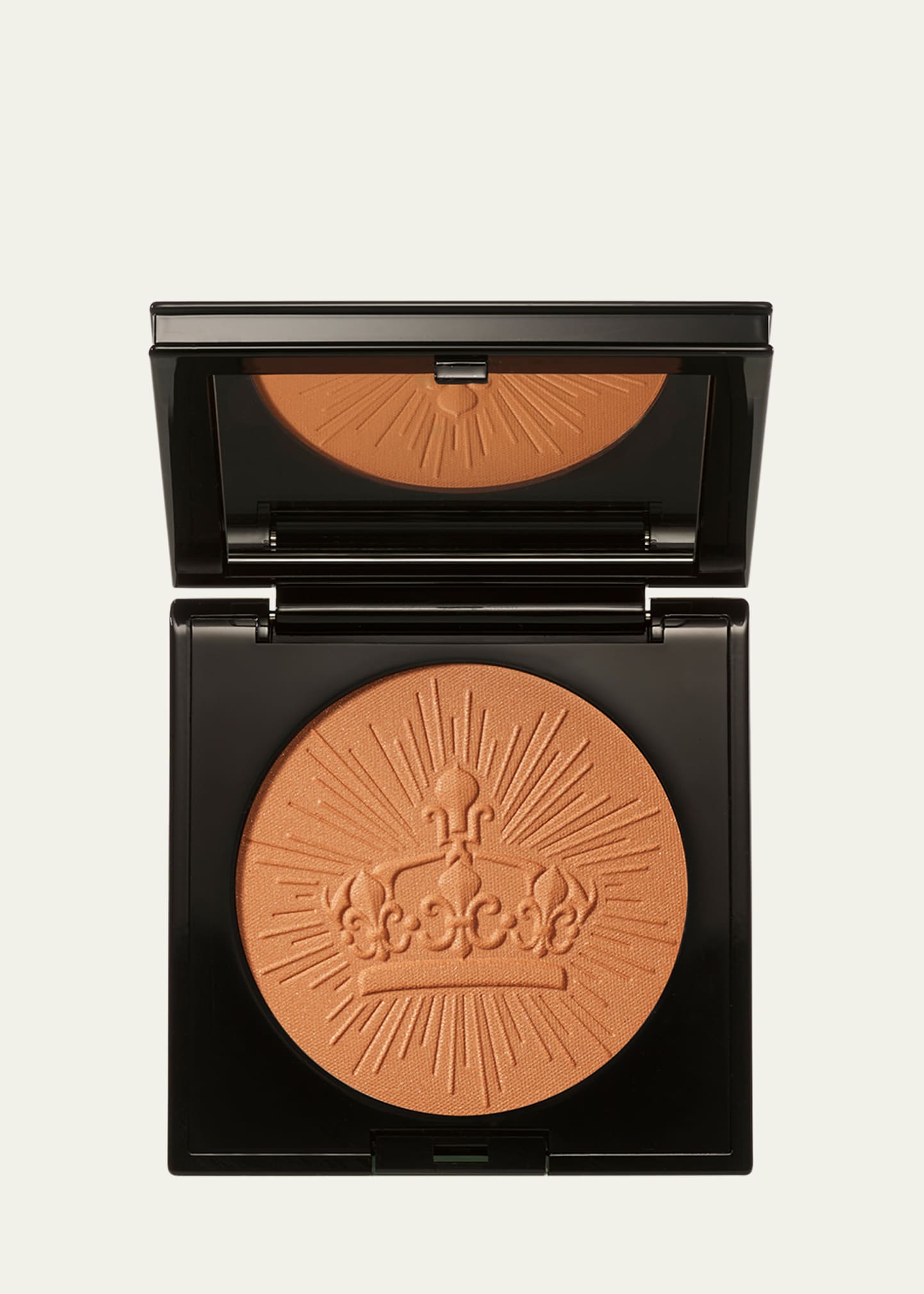Apply Divine Bronzer over the high points of the face emulating the look of skin kissed by the sun. Use sweeping motions to diffuse the bronzer over the cheekbones, temples, and jawline for a soft dimensional face structure. Accentuate facial features by blending Divine Bronzer, along the nose bridge and under the lips. Sweep the bronzer within the depth of the cheekbones, and temples for a sun-sculpted effect. To ensure a seamless finish, add warmth to the neck and décolletage.