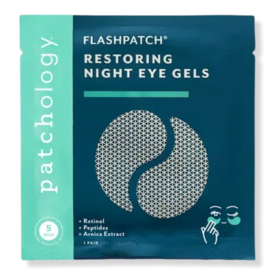 RESTORING NIGHT EYE GEL 1PR. Benefits: Patchology's proprietary HydraSurge5 Moisture System is more effective than topical creams or serums, accelerating the delivery of essential ingredients in just 5 minutea. These biodegradable eye gels help restore a brighter, more youthful appearance. Cruelty Free. Key Ingredients: Retinol: Helps cells turnover faster, renewing a smoother, youthful under eye appearance. Squalane: Naturally hydrates, softens, and protects from free radicals. Peptides:Reduce fine lines and crow's feet. Arnica Extract: Reduces the appearance of dark circles. Formulated Without: Sulfates. Phthalates.