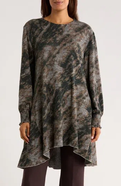 An abstract print adorns this cozy hacci-knit tunic top framed by gently puffed sleeves with smocked cuffs and a high-low hem. Crewneck Long sleeves with smocked cuffs 95% polyester, 5% spandex Machine wash, dry flat Imported