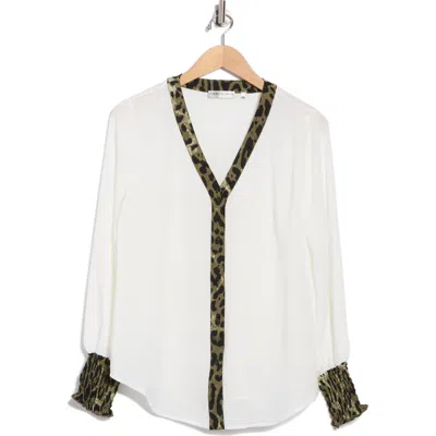 An eye-catching trim elevates the neckline, placket and smocked cuffs of this effortlessly chic button-up top. 27'' length (size Small) Front button closure V-neck Long sleeves 100% polyester Machine wash, line dry Imported