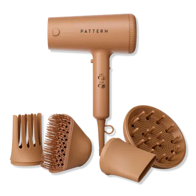 . Features: A high-performance dryer designed for curlies, coilies and tight-textures.. Ceramic Coated grill reduces hot spots to ensure even heat distribution helping to minimize heat damage.. A long-lasting and durable AC motor produces a powerful airflow reducing dry time.. 3 heat & 2 speed settings allow up to 6 customized airflow and heat settings for any curl type.. Lock-in cold shot delivers a burst of cold air to gently set styles, & enhance shine & luster.. Ion-controlled switch activates ions to smooth the cuticle or deactivates to add volume.. Dual-locking mechanism ensures that attachments stay firmly in place while styling.. Removable filter for easy cleanup (and helps extend motor life).. Includes: Diffuser Attachment: Features long, ventilated prongs that evenly distribute air from root to tip. Wide Tooth Comb Attachment: Mimics the design of PATTERNs Wide Tooth Comb gently detangling with wide-set prongs while ensuring even heat distribution. Brush Attachment: Rooted in the design of our award-winning Shower Brush, the heavyweight Brush is great for drying & stretching coils & tight textures, as well as shorter lengths.. Concentrator Nozzle: Achieve salon style blow outs directing heat on each section of hair. :