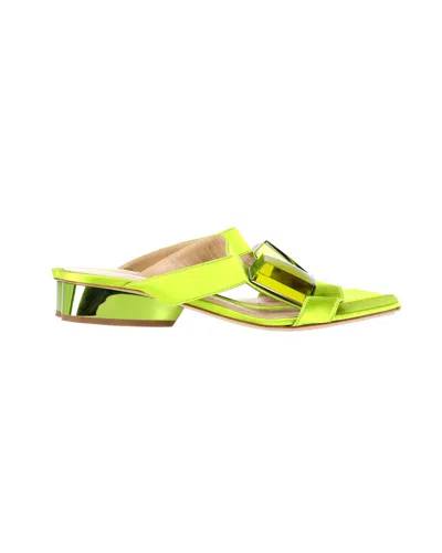 Elevate your footwear game with the Paul Andrew Cube Slides in Green Satin. These luxurious slides feature a sculptural, metallic heel and a crystal accent for a truly eye-catching and glamorous look. With leather lining and insole, an open toe design, and a leather sole with a rubber heel cap, these slides combine both style and comfort. Made in Italy, they guarantee the highest quality craftsmanship and are the perfect addition to any upscale ensemble.Paul Andrew Cube Slides in Green SatinSign of wear - Good condition soles are scuffed and worn & insoles have leather creasing as well, the right shoe has a black mark at the insole fabricSKU - 346099 Condition - goodColor - greenMaterial - SatinSize - EU39