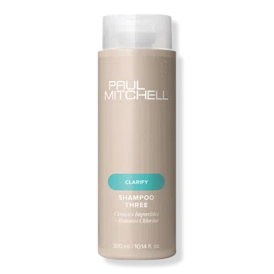 SHAMPOO THREE 10.14OZ. Benefits: Cleanses impurities, removes chlorine + strengthens strands. Ideal for all hair types; great for swimmers. Use before deep conditioning to remove buildup, which helps hair masks + treatments penetrate better. Features: Vibrant zesty pink grapefruit scent. Paraben free. Made without gluten. New packaging made with post-consumer recycled (PCR) materials + low-profile caps as part of Paul Mitchell's long-standing commitment to the environment. (Bottles + jars will be 50% PCR + tubes will be 25% PCR. Retail sizes only. Excludes pumps + select caps, which are made from virgin materials.). :
