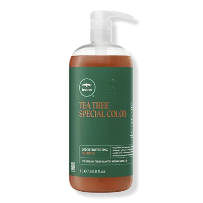 TEA TREE SPECIAL COLOR SHAMPOO 33.8OZ. Benefits: NOTE: Paul Mitchell's packaging is getting a makeover and the product you receive may vary from the images that are shown. Leaves hair clean + full of vibrancy. Ideal for color-treated hair. Features: Bergamot, mint leaf + orange blossom provide a refreshing aromatherapy-inspired experience. Clear post-consumer recycled (PCR) packaging (bottles + jars made from 100% PCR; tubes made from 25%; excludes pumps, caps + closures) features a label that does not need to be removed prior to recycling as part of Paul Mitchells long-standing commitment to the environment. Shampoo bottle has a raised S differentiator to increase accessibility. Color safe. Paraben free. Gluten free. UV protection. Key Ingredients: 100% Australian tea tree is sourced from a farm in Australia that is certified for their responsible sourcing + harvesting practices. Contains the famous Tingle Complexa blend of tea tree, peppermint + lavender that leaves a cooling, tingling sensation on the scalp. Rooibos tea botanicals help protect hair color from the elements + fading.