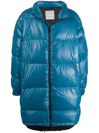 Petroleum blue oversized quilted coat from Paura featuring a high standing collar, a front zip fastening, long sleeves, elasticated cuffs, side slit pockets, a drawstring hem and a mid-length.