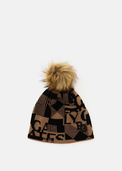 Beige Check Logo Pattern Cable Knit Beanie With Brahma Pattern