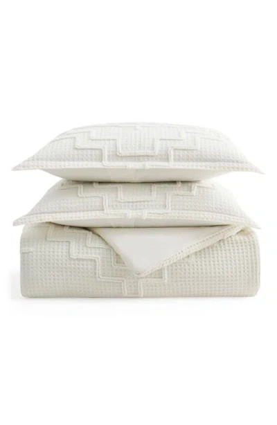 Waffled cotton with tufted fleece in a geometric pattern brings rich texture and dimension to this three-piece bedding set, which includes a comforter and two matching pillow shams. 90"x 92" Queen; 96" x110" King Set includes 2 pillow shams 100% cotton Machine wash, tumble dry Imported