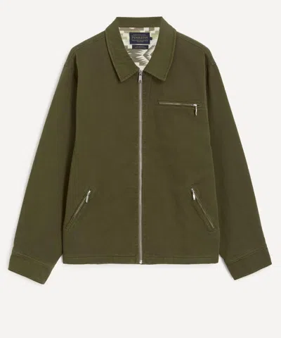 Weaving world-class woollens in portland, oregon since 1863, Pendleton channels its rich heritage into this jacket. Drawing from classic americana design codes, this sage green jacket is crafted from garment-washed soft twill, featuring a zip fastening, point collar, two slant pockets, and a single chest pocket with a zip closure. Lined with cotton in a Pendleton archival print and vintage buttons at the shoulder cuffs, it adds a refined workwear feel to your outerwear edit. Blanket-lined jacket Garment-dyed twill cotton Sage green colourway Front zip fastening YKK silver vintage two-way zip detailing Spread collar Cuffed sleeves with vintage buttons Single chest pocket with zip closure Cotton lining with vintage Pendleton archival print Regular fit SIZE & FITModel is 188cm/6'2' Chest: 89cm Waist: 71cm and wears size M