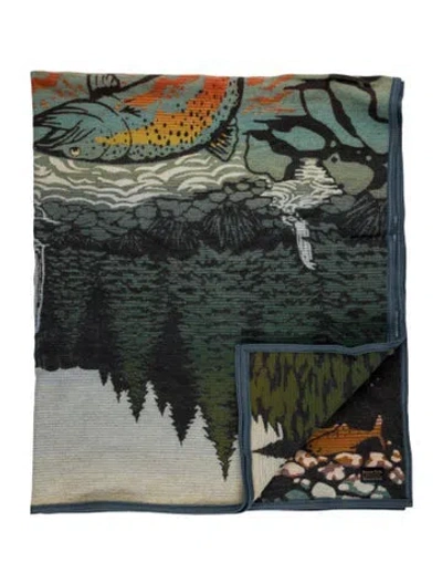 Grey and multicolored Pendleton throw blanket with aquatic motif at surface throughout, finished edges and brand tag at surface. Made in USA. | Pendleton Wool-Blend Throw Blanket in Grey/Neutrals