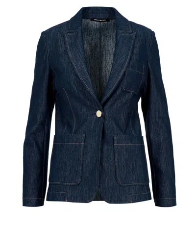 - Denim - Stretch - Single-breasted model - Spear lapel collar - Left side breast patch pocket - Long sleeves - Metal button - Front patch pockets - Contrast stitching - Unlined - Straight hem - Slim fit