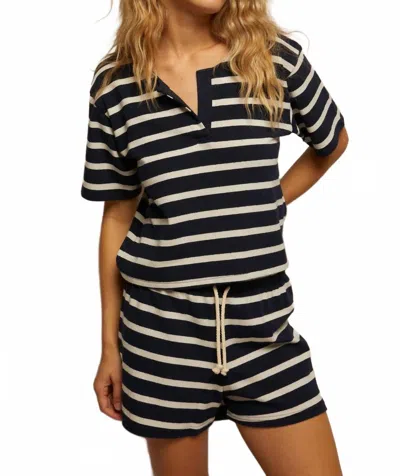 Fit to perfection, we love these high-waist shorts and you will too.Introducing the Jesse Drawstring Short by perfectwhitetee, a stylish and comfortable choice in a navy natural stripe perfect for summer vacations. These pull-on style shorts boast a relaxed fit with a 2.5" inseam and feature an elastic waist with a hidden drawstring for customized comfort. Crafted from a thoughtful blend of 97% recycled cotton and 3% spandex, these shorts are proudly made in the U.S.A. Care instructions are straightforward with machine wash capabilities for easy maintenance.