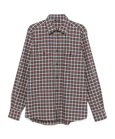 Shirt collar, long sleeves, button fastening at front, check pattern and rounded hem.