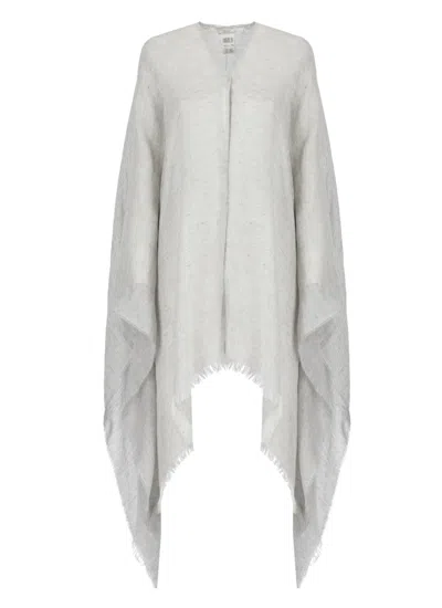 A flowing linen cape made from premium grey linen with shimmering lurex details. Fringed trims add a bohemian touch, perfect for versatile layering and an elegant drape. An ideal statement piece to enhance any outfit.- Material: Premium grey linen- Details: All-over lurex embellishments- Trims: Fringed- Style: Bohemian aesthetic- Function: Versatile layering