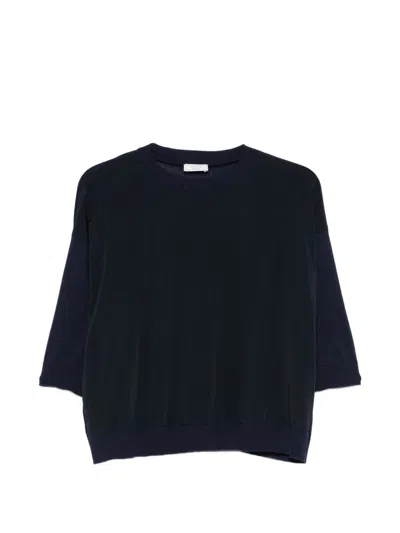 Elegant blue panel knit top, featuring knit inserts, a crew neck, and 3/4 sleeves. Ribbed details on the hem and cuffs for a refined touch.