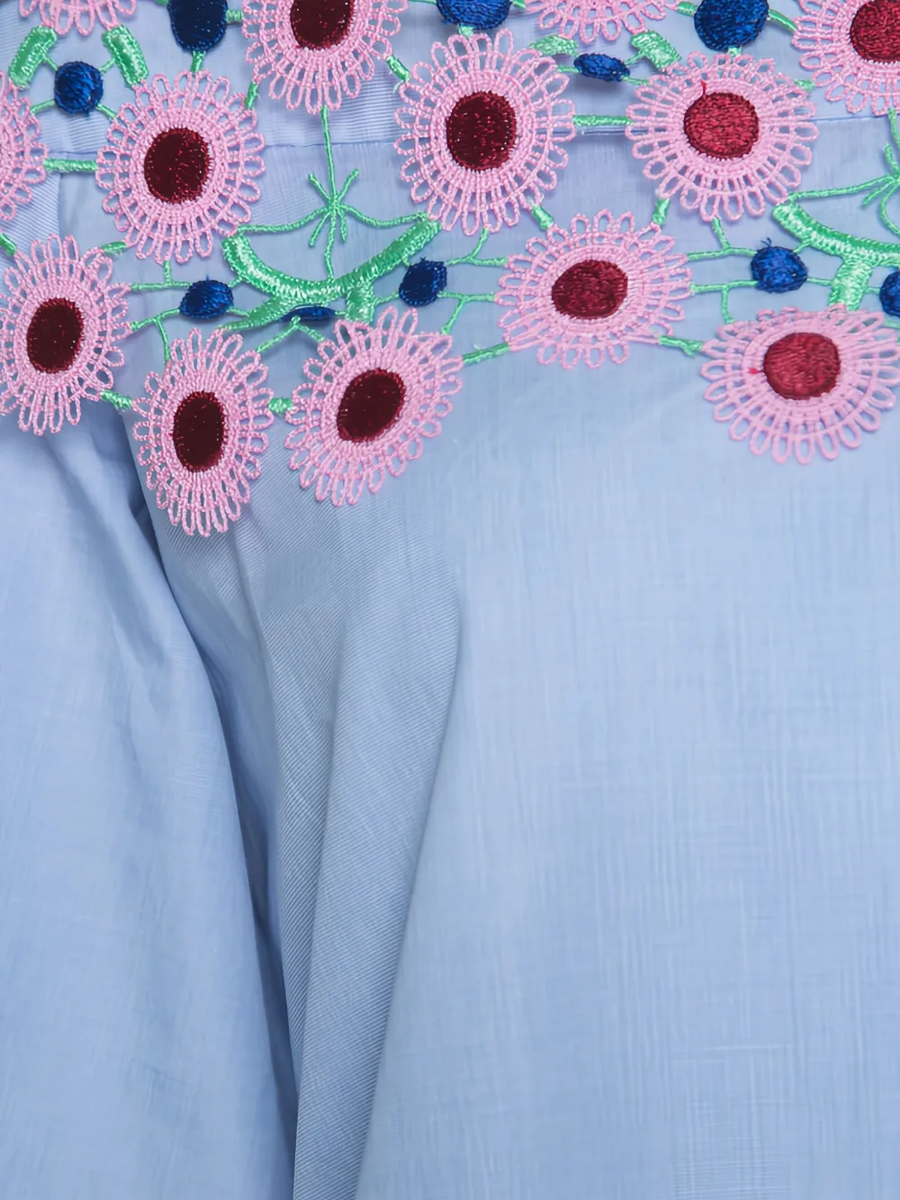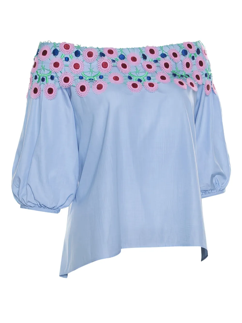 light blue cotton off-shoulder design balloon sleeves floral embroidery Condition: GOOD. This previously owned and used item is in good condition with minimal signs of use. This may include fading of material or plating and scratches.
