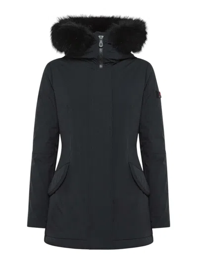 Slim jacket with fur in a smooth tone in recycled feather with stretch canvas and performing membrane resistant to rain and wind The garment enhanced by a large detachable neck in fox fur on tone on tone that together drys the female silhouette together, the central hidden central cursor and buttons expresses a modern and essential style and refined style, have a must for the winter wardrobe. Main characteristics hidden with double cursor zip and buttons medium length of material certified in recycled feather detachable neck with real fox fur fox on light tone light tone resistant to rain and wind fitted slim fit
