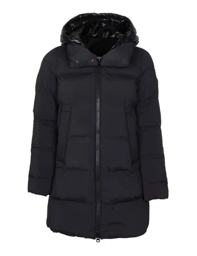 Medium down jacket in double fabric black color lightweight poplin fabric in nylon and polyester microfiber the hood, with adjustable drawstrings, is made of particularly shiny and soft nylon water repellent and wind resistant, with pfc free treatment, respecting the environment fabric made with certified recycled yarn and recycled feather padding length: medium fixed hood with contrasting material high pockets sustainable padding lightweight nylon and polyester microfiber fit: regular composition: 70% polyamide 30% polyester lining: 100% polyester padding: 60% goose down 40% feather - fill power 750 fur: without fur