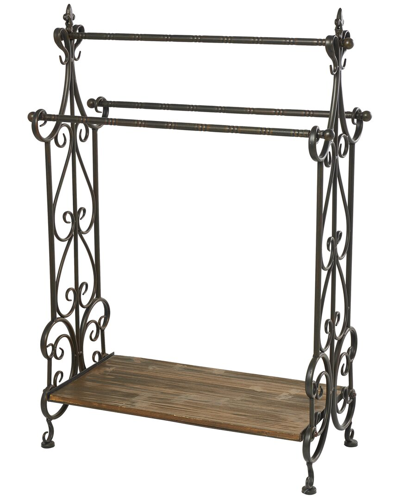 Color/Finish: Black Designed With Natural Finish To Complement Your Traditional-Themed Home. Designed With Felt Or Rubber Stoppers At The Base That Prevent Scratching Furniture And Table Tops, As Well As Sliding Around. This Item Ships In 1 Carton. Furnished With Bottom Pinewood Shelf For Shoes Or Clothes. Suitable For Indoor Use Only. Some Assembly Required. Maximum Weight Limit Is 25 Lbs. This Is A Single Black Colored Blanket Rack. Pine Quilt Rack Features A Single Shelf. Vintage Style. Infuse Your Home With Romantic Nostalgia And Timeless Grace, Where Ornate And Antique Details Showcase Your Personality And Create A Sanctuary Of Charm And Warmth In The Home. Black Quilt Rack With Shelf Is Crafted With Solid Pine Wood And Metal Material. This Towel Rack Highlights A Black Fleur-De-Lis Rack And Side Panel With Natural Wood Brown Bottom Shelf. Rectangular Storage Unit Is Built With 3 Convenient Metal Quilt Racks At Varying Height For Optimal Display And Spacious Bottom Shelve On An Elevated Scrollwork Structure. Measures 28In X 13In X 41In 1 Shelf/Shelves Pine Natural Or Dyed Animal Products Sourced From China Wipe Clean With A Dry Cloth Assembly Required Imported