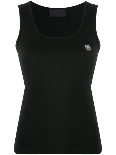 Make a bold statement this season with this Philipp Plein tank top. Crafted from a blend of black material, it features a round neck and sleeveless fit. In true Philipp Plein fashion, it comes embroidered with the designer's signature logo patch to the chest. POSITIVELY CONSCIOUS: At least 50% of the main material of this product meets our conscious criteria: for example, it's either organic, recycled, upcycled, or independently recognised as being better for the environment (such as linen, ramie, Tencel, etc.).