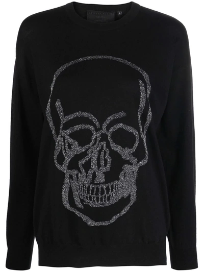 Black wool skull-print jumper from PHILIPP PLEIN featuring ribbed detailing, skull print, round neck, long sleeves and straight hem.