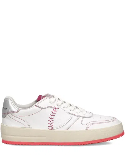 4cm sole height | Nice Low women's leather sneakers | Rubber sole with serrated hem | Contrasting fluorescent fucsia heel tab | Holes on toe for breathability | Matching sole color | Visible stitching | Logo on tongue and back | Flat laces