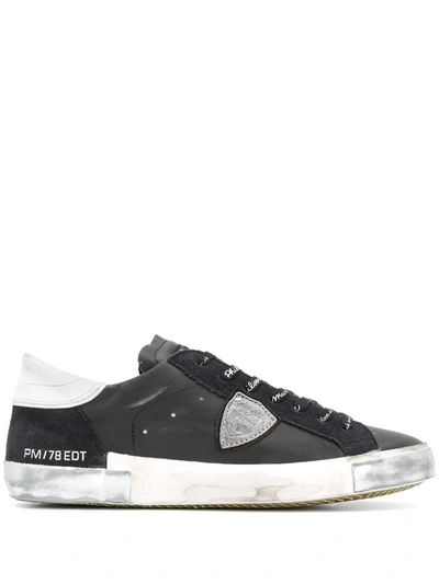 White/black leather Paris logo patch leather sneakers from Philippe Model Paris featuring logo patch at the tongue, round toe, front lace-up fastening, branded insole and flat rubber sole.