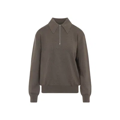 PHOEBE PHILO Light Brown Wool Zip Polo With Pointed Collar And Ribbed Details In Gray