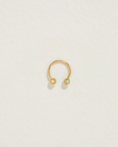 The iconic and versatile circular barbell is elevated with a duo of opals set in 14k gold. Sold as a single. SIZE & MATERIALS Composition: 14k yellow gold, opal Measurements: Inner diameter: 8mm, 17 gauge Closure: Externally threaded bezel Read about piercing jewelry and closure systems