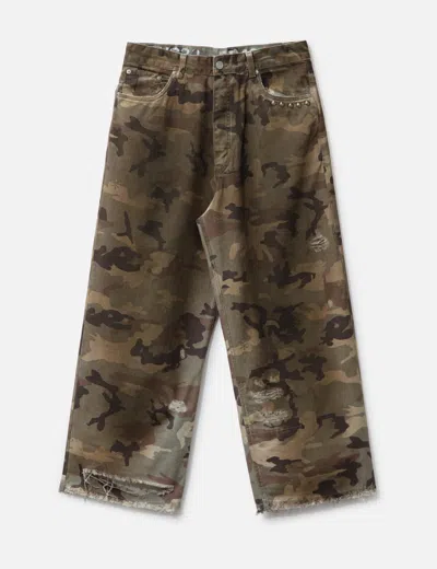 PIET Distressed Camo Oversized Denim Made of cotton twill fabric Earthy-washed for vintage look Camo print and distressing worn effect throughout Loose-fit Button fly 5-pocket design Gold-tone rhombus studs on front and back pocket Branded label and logo embroidery at back Color: Camo