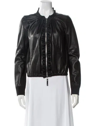 Pinko Leather Jacket Black Ruffle Embellishment & Stand Collar Slit Pockets & Zip Closure Fit: Jackets by Pinko typically fit true to size. | Pinko Leather Jacket in Black, Women's US6, IT42 | M