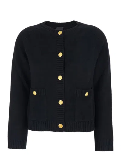 PLAIN Black Crewneck Cardigan With Jewel Buttons And Two Front Patch Pockets In Wool Woman In Blue