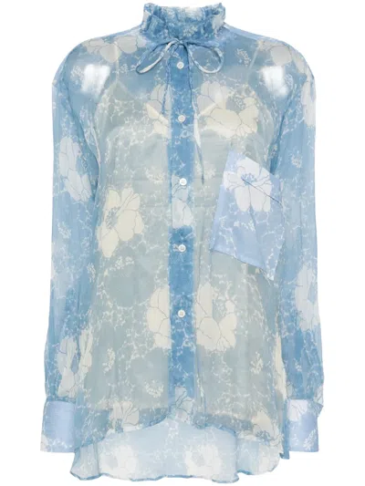 PLAN C Floral Silk Shirt In Blue