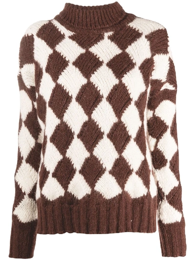 Brown/white alpaca wool geometric roll-neck jumper from PLAN C featuring geometric print, roll neck, long sleeves and fitted-cuff sleeves.