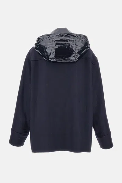 Unlined wool blend jacket with four front pockets and a removable nylon drawstring hood. Front button closure with covered buttons. Made in Italy, colour blue. Composition: 56% Wool, 40% Nylon, 4% Wool