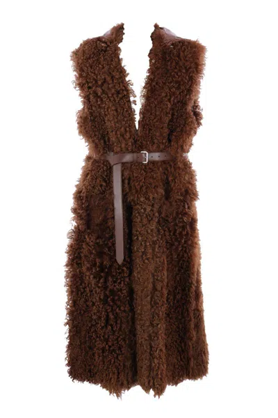Plan C reversible vest made of tobacco brown shearling. Featuring a V-neckline, removable hood, hook closure, adjustable matching belt with silver-tone metal buckle, front pockets, and straight hem with back slit.