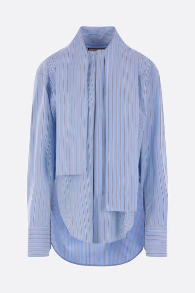 Plan C shirt made of blue and white striped cotton poplin. Featuring a crew neckline with a removable scarf, hidden front button closure, long sleeves with buttoned cuffs and a rounded hem that is longer at the back.