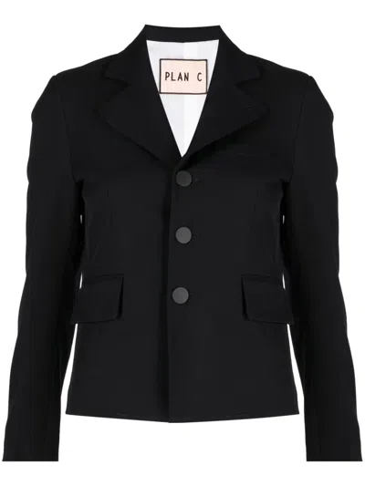 single-breasted wool blazer from PLAN C featuring midnight blue, wool, twill weave, wide notch lapels, front button fastening, long sleeves, buttoned cuffs, chest welt pocket, two front flap pockets and American rear vent.