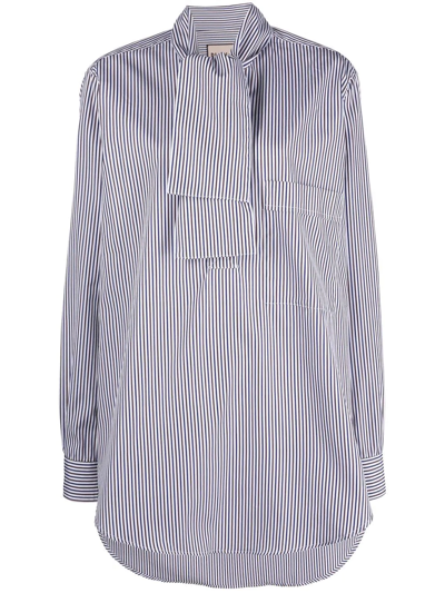 striped poplin shirt from PLAN C featuring blue, cotton, poplin texture, stripe print, gathered tie neck, front button fastening, long sleeves and curved hem.