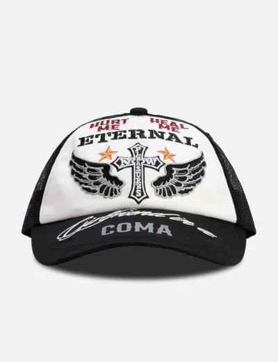 Pleasures Coma Mesh Cap Six-panel construction Front panels made of cotton twill Trucker mesh back panels Logo embroidery at front and brim Low profile crown Snapback closure Color: Black