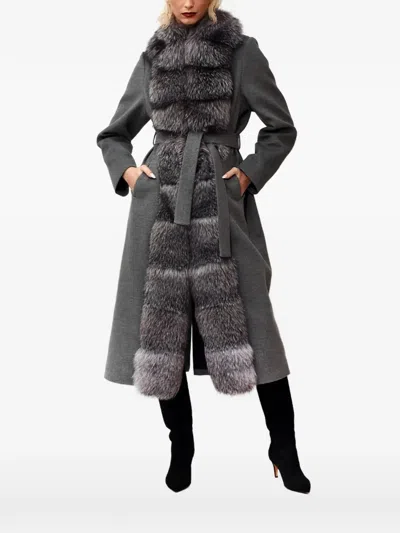 grey faux-fur trim two side pockets long sleeves belted waist mid-length