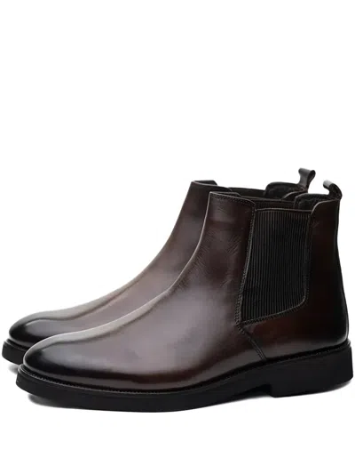 brown elasticated side panels pull tab at the opening round toe flat sole slip-on style
