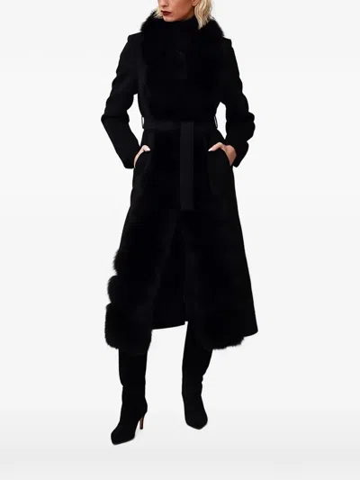 black faux-fur trim wide collar belted waist two side pockets long sleeves