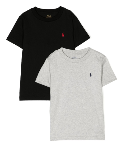 logo-embroidered T-shirt set from RALPH LAUREN KIDS featuring navy blue, grey, white, cotton, jersey knit, signature Polo Pony motif, embroidered logo at the chest, round neck, short sleeves, straight hem and pack of three.