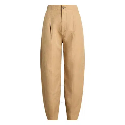 Polo Ralph Lauren Ladies Bottoms. Fashion category - Pants & Leggings. SKU - 211924800004. Color - Medium Beige. Polo Ralph Lauren Silk Blend Tapered Pants. Crafted from a lightweight silk-twill blend, these pants feature a high waist, slim fit with subtle pleats, and buttoned waistbands with belt loops. They have a concealed zip fly with a button closure, adjustable buttoned waist straps, two front slanted pockets, and two external back pockets. 50% Mulberry silk, 38% linen, 12% cotton.