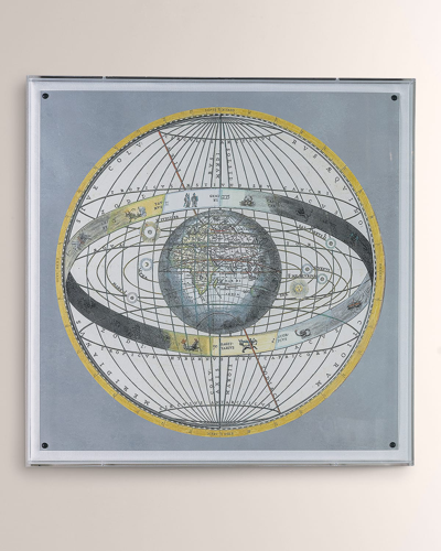 Take a journey around the sun and the globe. The zodiac circles the moon and the stars in our Celestial Series. Framed under an acrylic shadowbox box frame, the giclee print is mounted to an interior board wrapped in a cotton/linen fabric. Finished at each corner with black nail head. Approx. 30"Sq. x 2.5"D Weight, 16.0lbs Includes D-ring hanging hardware Wipe clean Made in USA from imported materials Boxed weight, approximately 18.0lbs