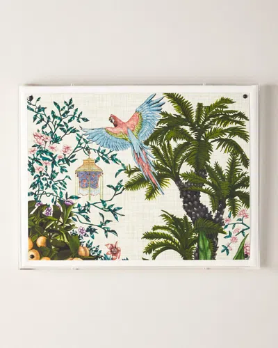 Whimsical and colorful tropical panels, our artwork collection features a giclée print mounted under a 2.5" deep Lucite® shadow box. Attached to a linen wrapped interior panel, the artwork is finished with black nail head in each corner. 26"W x 2.5"D x 20"T. Imported. Boxed weight, approximately 14 lbs.