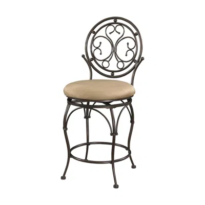 The Big and Tall Scroll Circle Back Counter Stool has an elegant design and style. The stool features a warm bronze finish and a plush tan upholstered seat. Designed to suit people large and small, the seat is a generous size for optimal comfort. The tall back features an eye-catching scroll design. Perfectly suited for a kitchen counter, island or high top table.