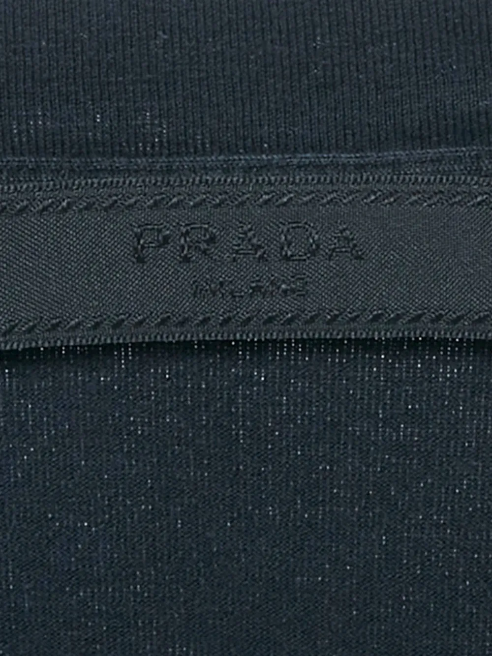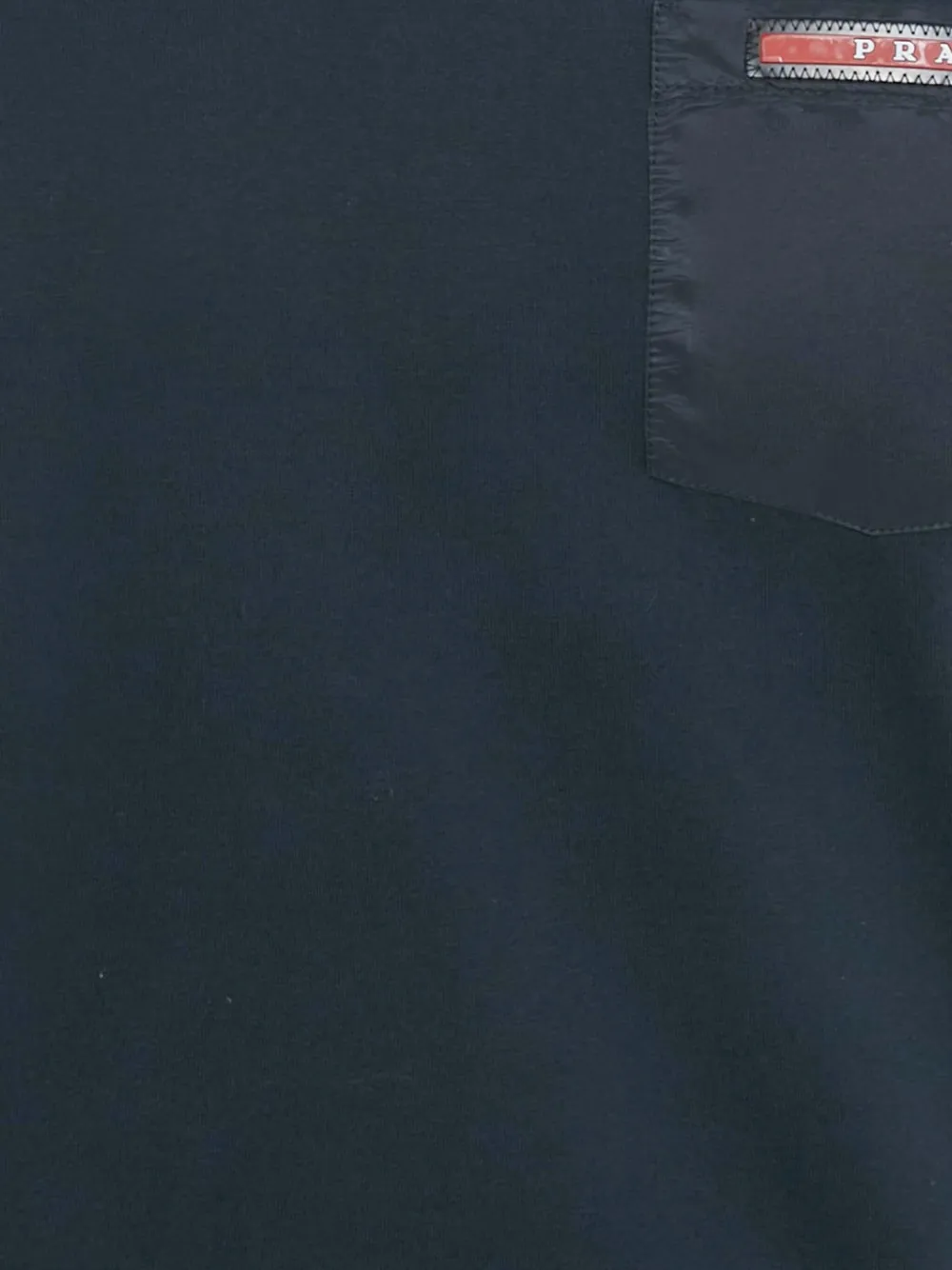 Cotton|-|Fair|Immerse yourself in effortless style with this Prada Sport V-neck tee. Crafted from premium cotton blend with a hint of elastane for a comfortable fit, its midnight blue hue paired with a unique rubber logo is a subtle nod to exclusivity. Offering a practical nylon pocket,
